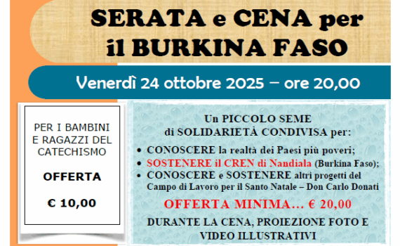 Finalmente si riparte, in tutti i sensi, per il Burkina Faso! Dopo diversi anni in cui non era possibile recarsi in quel Paese a causa di attacchi terroristici, finalmente si può ripartire! Il diacono Andrea, insieme ad altri volontari del Campo di Lavoro per il Santo Natale – Don Carlo […]